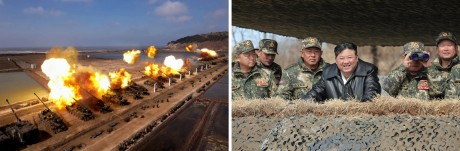 Vážený soudruh Kim Čong-un dohlíží na útočné taktické cvičení pěších a tankových podjednotek